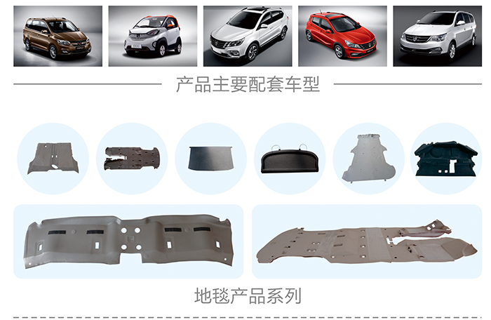 公司產(chǎn)品配套項(xiàng)目涵蓋轎車、MPV、SUV、新能源電動車領(lǐng)域。公司主要參評有汽車頂棚、隔音墊、地毯、大型注塑件、橡膠制品、EPP泡沫等車內(nèi)飾品件。